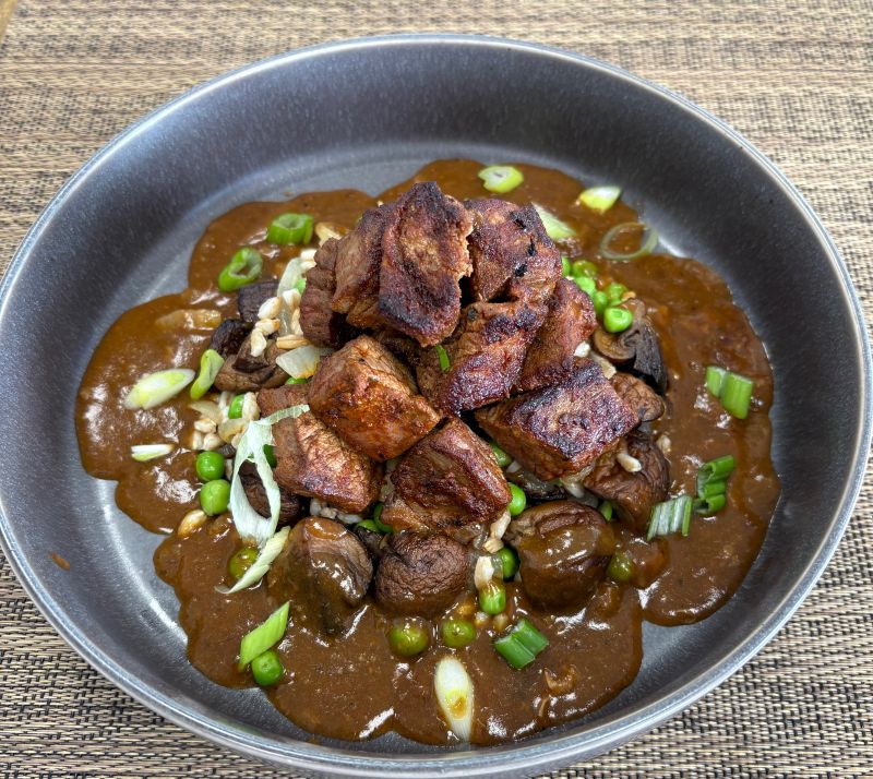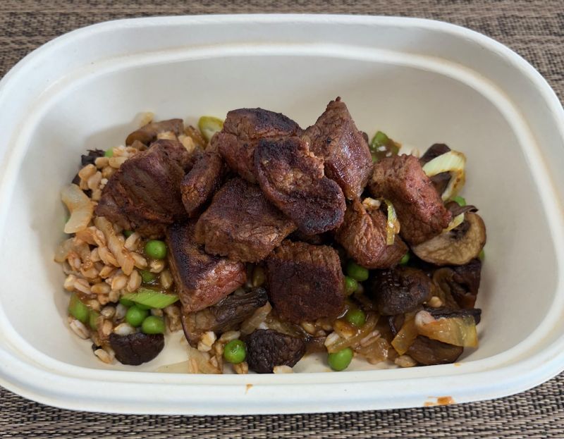 Slow-braised flank steak in a savory, comforting goulash sauce, paired with protein-rich farro and finished with sautéed onions and tender green peas. A hearty, balanced feel good meal made with savory ingredients to keep you fueled and satisfied.