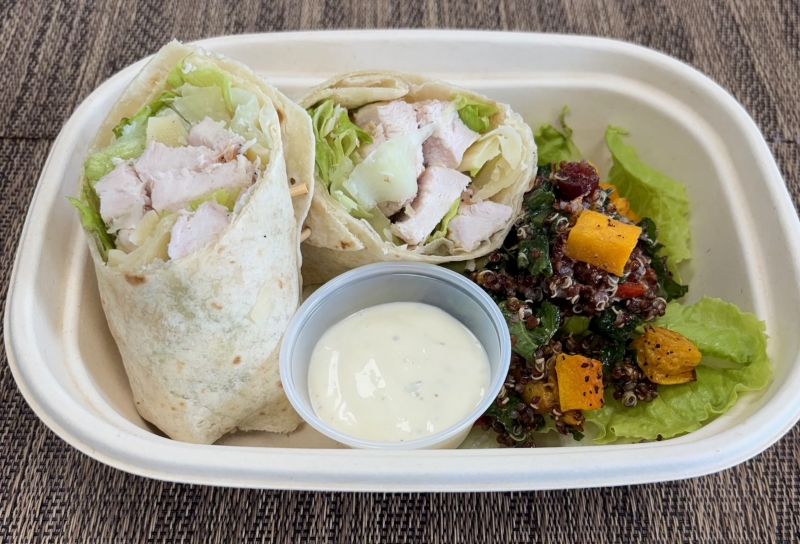 Grilled chicken breast, crisp romaine lettuce, shaved Parmesan, and creamy Caesar dressing wrapped in a soft flour tortilla. Served with a hearty side of quinoa salad featuring roasted butternut squash, sweet dried cranberries, caramelized white onions, and tossed in a rich maple balsamic dressing for a perfect balance of savory and sweet.