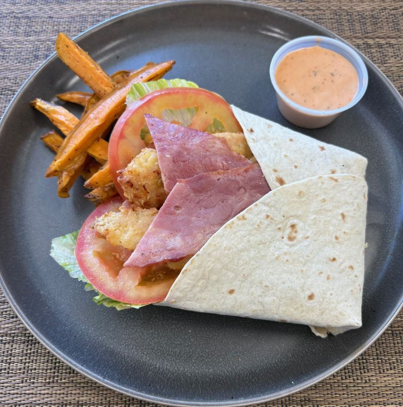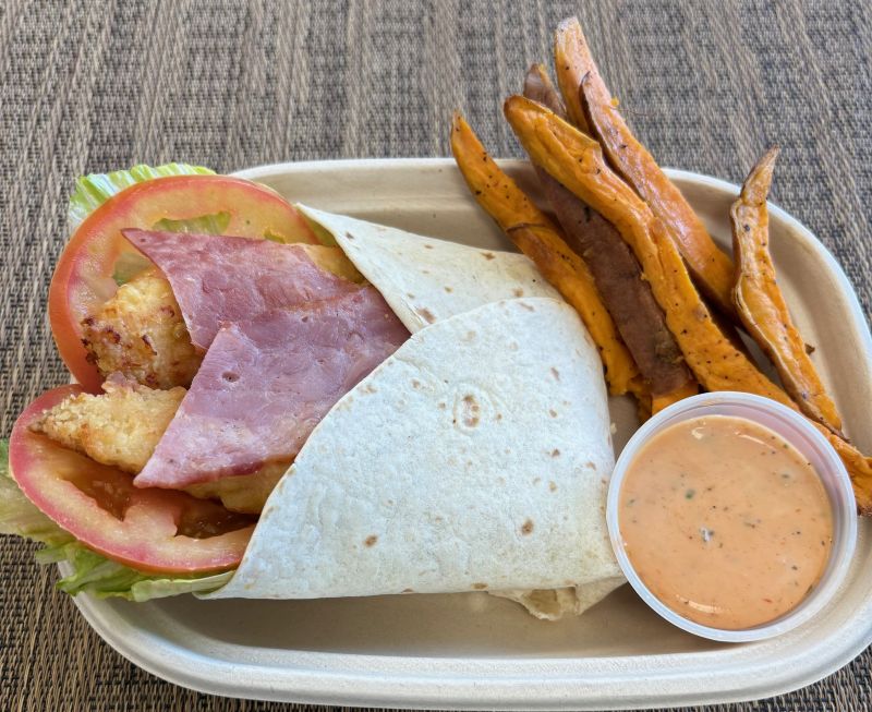 A satisfying, protein-packed snack wrap made with tender breaded grilled chicken, crispy turkey bacon, fresh lettuce, and juicy tomatoes, all drizzled with creamy ranch dressing and wrapped in a soft tortilla. Served with a side of naturally sweet roasted sweet potatoes for the perfect balance of savory and wholesome flavor. A quick, delicious option that keeps you fueled without weighing you down.