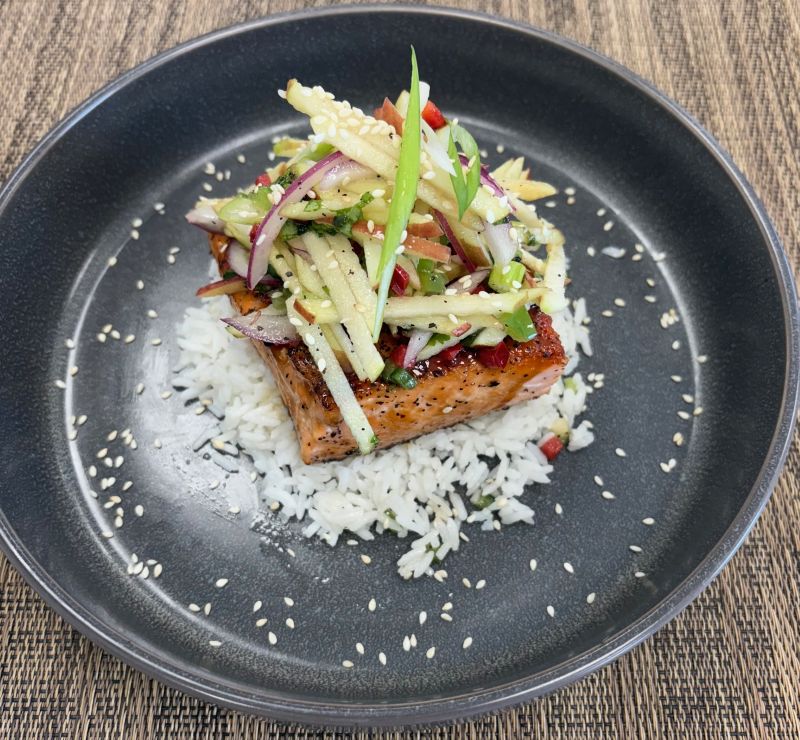 Perfectly seared salmon fillets glazed in a modern fusion teriyaki sauce — a silky blend highlighted by a touch of honey for natural sweetness and a beautiful glossy finish — served over a bed of fluffy steamed rice. The rich, umami-forward glaze soaks gently into the rice, complementing the salmon’s tender texture. On the side, a crisp apple slaw adds a refreshing contrast, with fresh apples tossed in a zesty citrus dressing and sprinkled with sesame seeds. The result is a contemporary twist on a classic — balanced, vibrant, and effortlessly fresh.